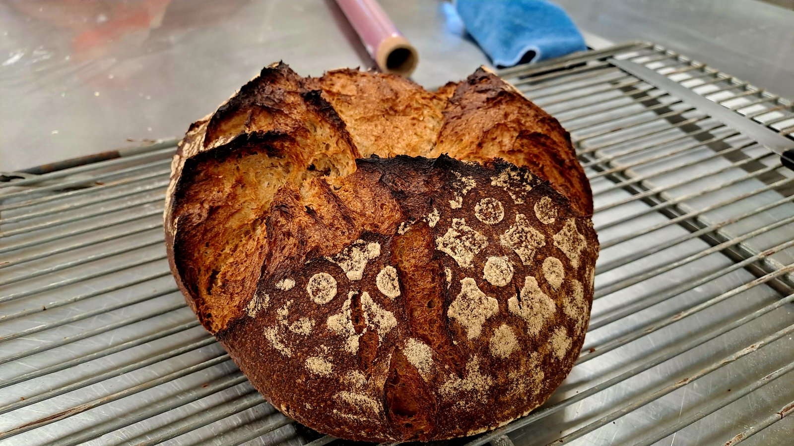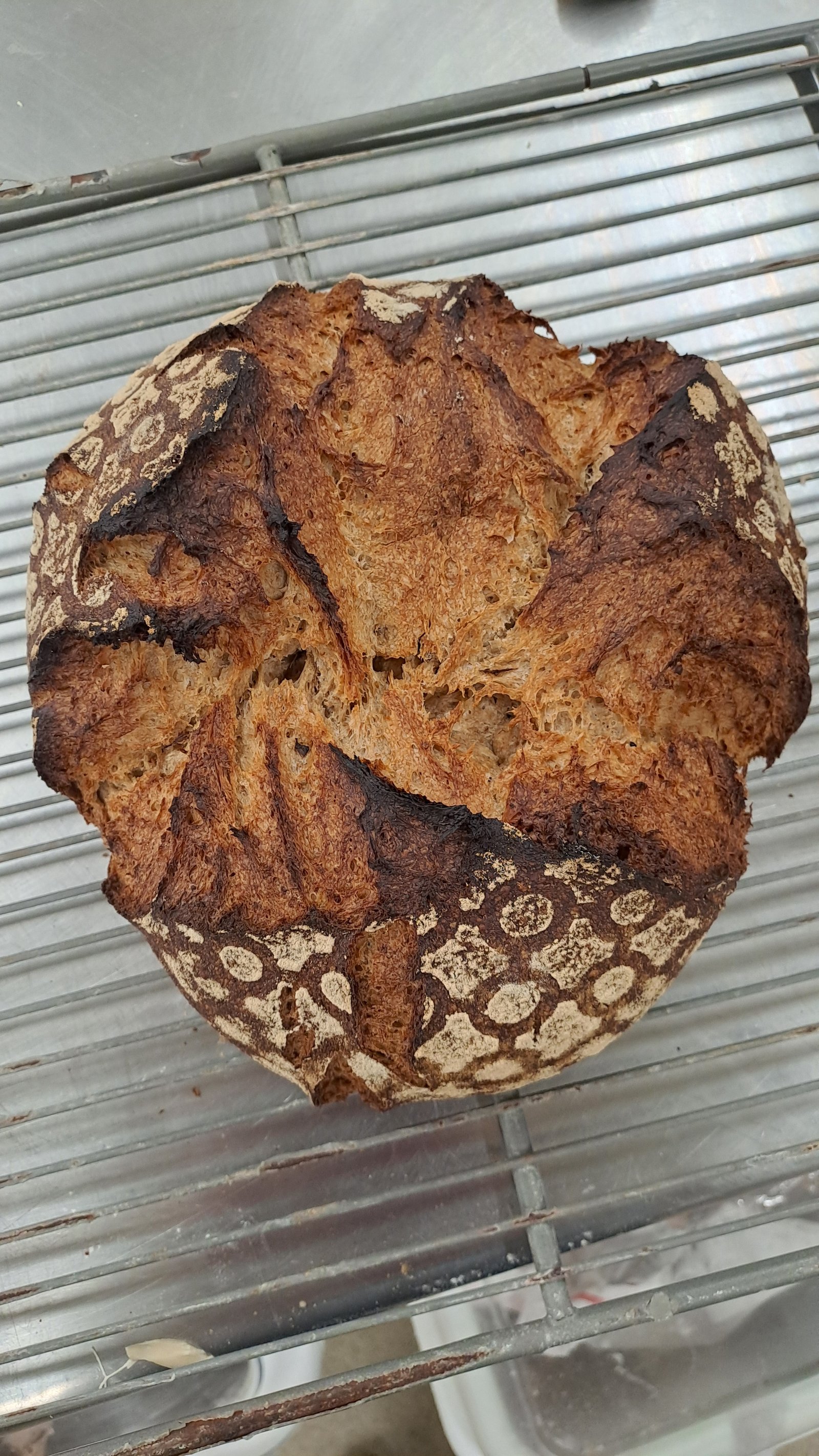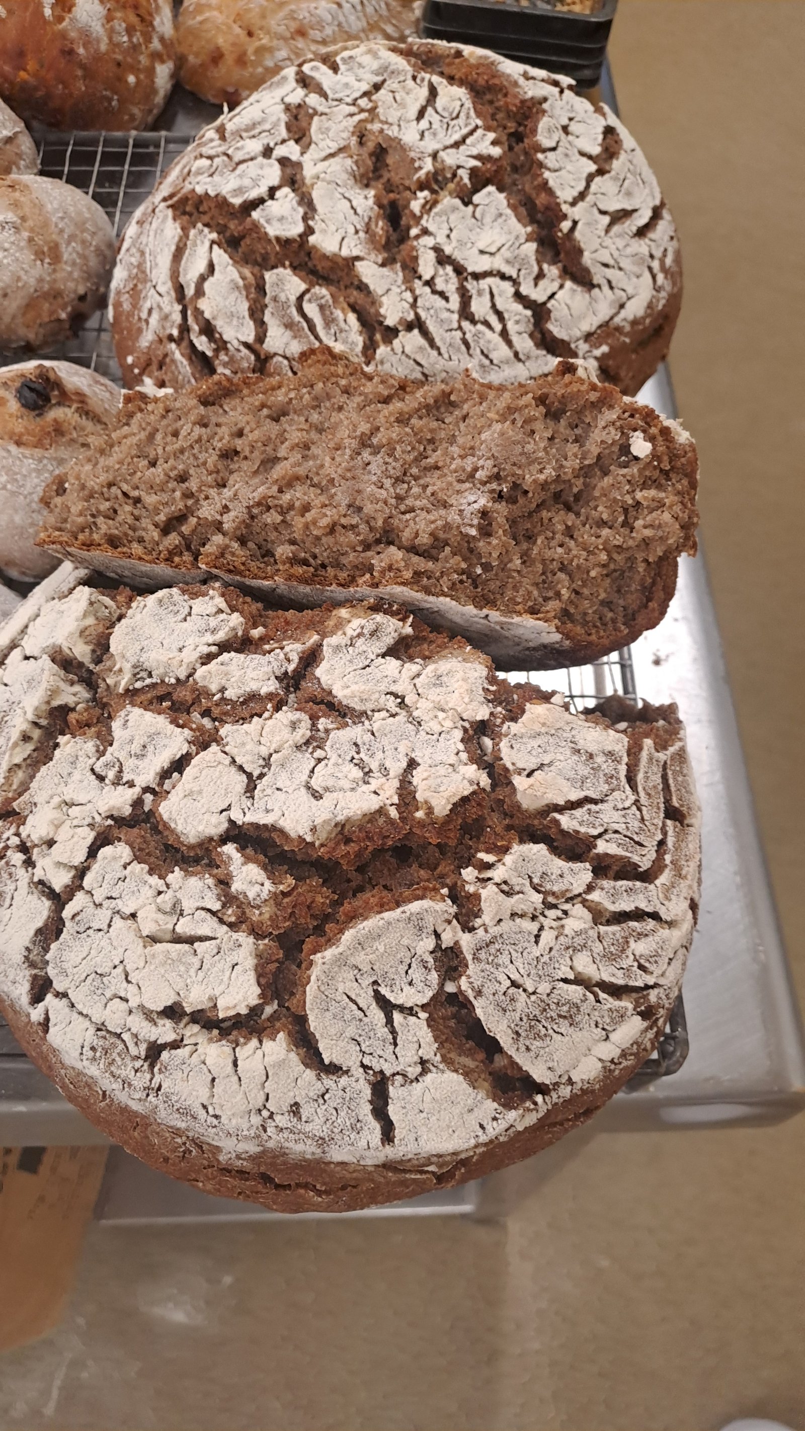 Centeno integral: 40% masa madre de trigo, 95% de humedad, fermentación 16 horas 3°C.